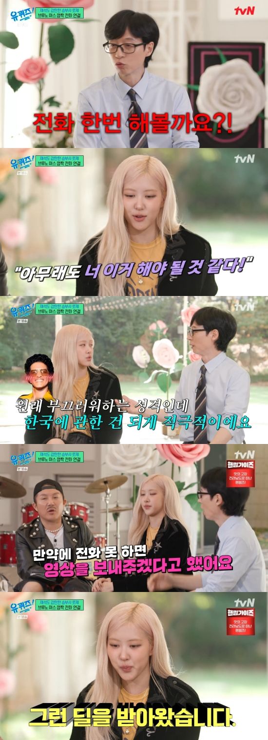 로제는 "거의 (브루노 마스의) 매니저다. 사람들이 너무 섭섭해한다고 여기 안 와서. 한국 팬분들이 너무 섭섭해한다고 이건 좀 해야 될 거 같다' 했더니 만약 그때 못 하면 영상을 보내주겠다고 했다. 그런 딜을 받아왔다"라며 덧붙였고, 유재석은 "대단하다. 로제가 승부사다"라며 칭찬했다.