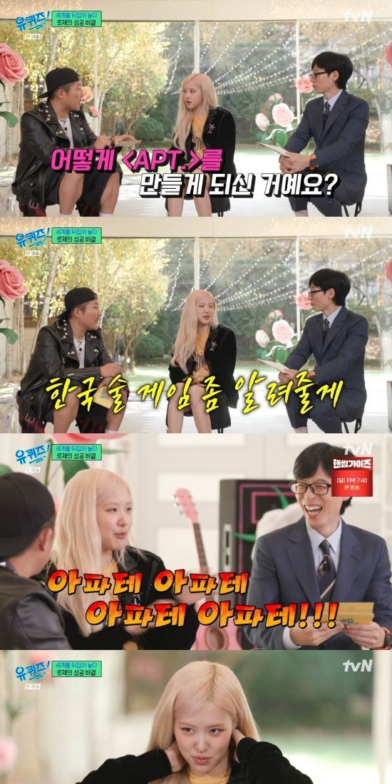 또 조세호는 'APT.'에 대해 "어떻게 하다가 그 노래를 만들어야겠다고 생각하신 거냐"라며 물었고, 로제는 "스튜디오에서 친구들이랑 막 작업을 하기 시작했을 때인데 '내가 한국 술 게임을 알려줬다. 사실 아파트 게임을 제일 좋아한다. 간단하고 쉬우니까"라며 설명했다.