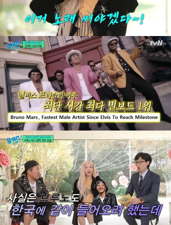 유재석은 "브루노 마스와 함께한 게 알려지면서 굉장히 놀랐다"라며 궁금해했고, 로제는 "사실은 브루노도 같이 들어오기로 했었는데 사실 여기 ('유퀴즈') 제가 초대해서 한다고까지 했었다. 그래서 엄청 기대했는데 비자 이런 문제 때문에. 그래서 되게 아쉬워하고 있다"라며 전했다.