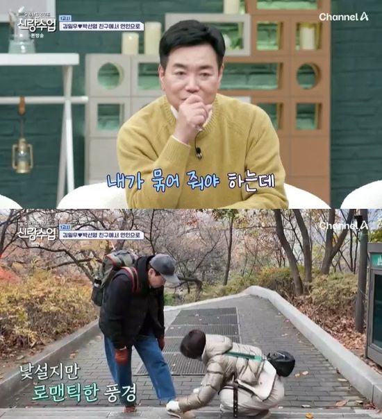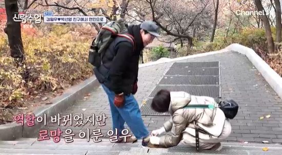 이후 본격 등산에 나선 두 사람. 계단을 오르고 얼마 지나지 않아 김일우의 신발끈이 풀리자 박선영이 망설임없이 무릎을 꿇고 끈을 묶어 눈길을 끌었다.