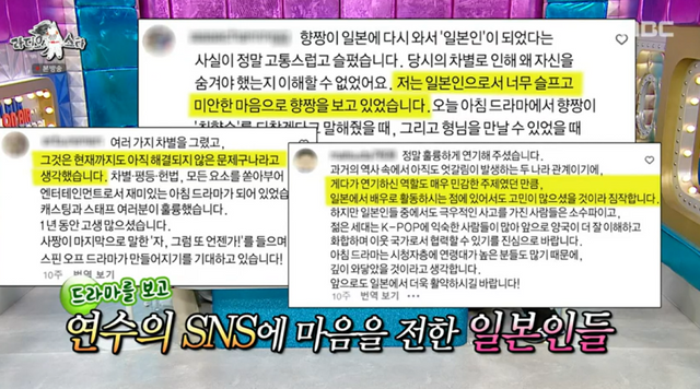 이어 그는 “‘왜 한국인한테 우리 소중한 수신료를 쓰냐’고 항의 전화도 왔다고 한다. 굉장히 센세이셔널한 작품이라더라”며 “일본인 분들도 SNS로 잘봤다고 댓글을 남겨줬다. 그래서 한 두명이라도 제가 설득했구나 싶었다”고 뿌듯해했다.