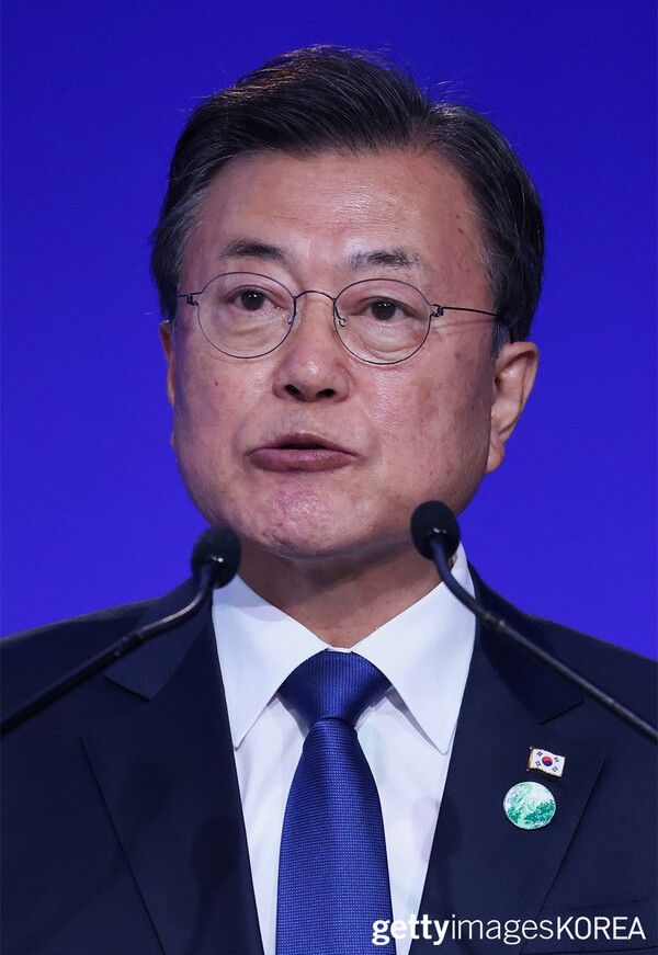 ▲21년 영국 글래스고의 SECC에서 열린 '제26차 유엔기후변화협약 당사국총회(COP26)'에서 연설 중인 문 전 대통령 (사진= gettyimagesKOREA)