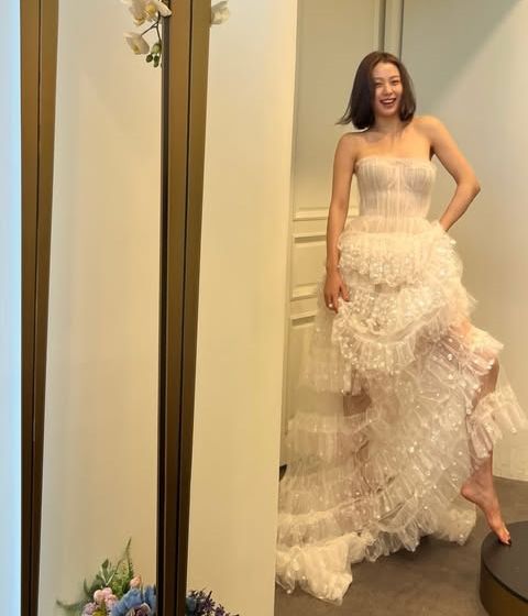 사진 속 고민시는 튜브탑 스타일의 드레스를 맨발에 입고 장난기 가득한 미소를 짓고 있다. 해당 드레스는 마치 코르셋 같은 느낌으로 고민시는 특유의 발랄하면서도 완벽한 보디라인 비율로 이를 소화해 감탄을 더하는 것.
