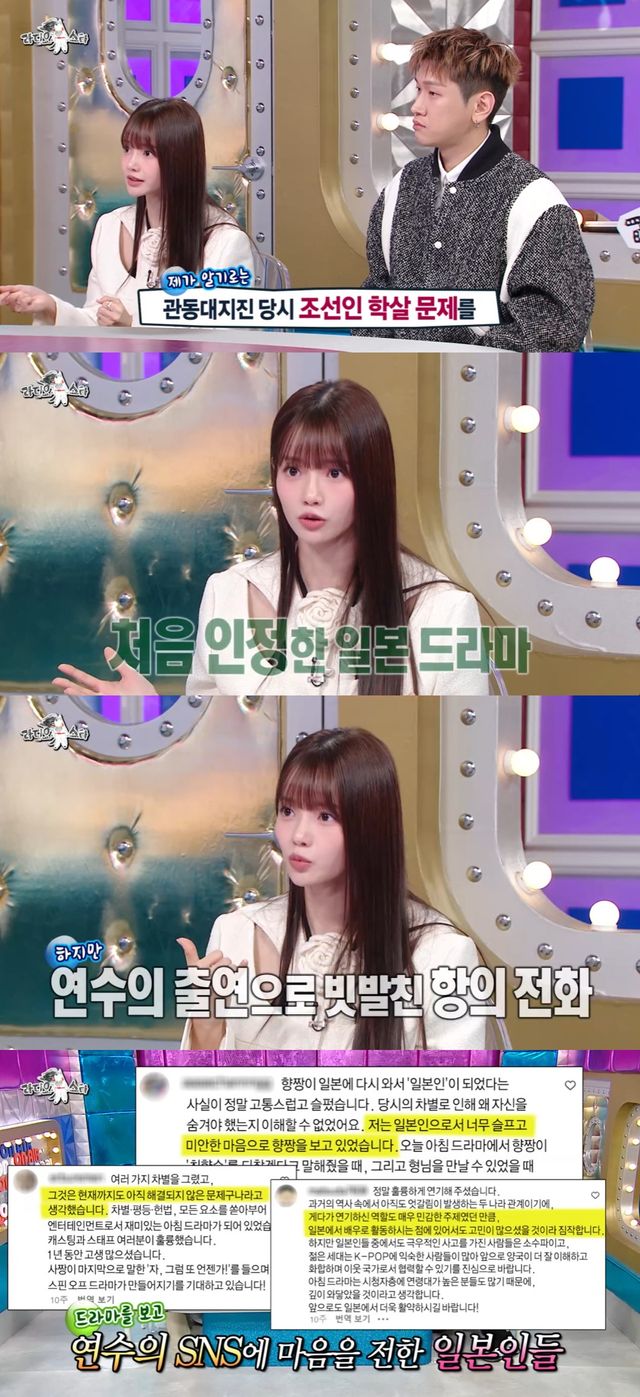 이어 하연수는 "제 출연을 두고 일본 분들이 '우리 수신료를 왜 한국사람에게 쓰냐'면서 항의 전화도 왔다더라. 반면에 또 저한테 '몰랐던 역사를 알게 해줘서 고맙다'고 SNS 댓글을 써주시는 일본 분들도 계셨다"고 전했다.