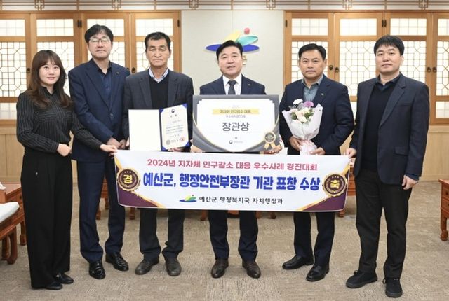 [파이낸셜경제=김영란 기자] 예산군은 지난 10일 행정안전부가 주최한 ‘2024년 지자체 인구감소 대응 우수사례 경진대회’에서 작년에 이어 두 번째로 행정안전부 장관상을 수상했다고 밝혔다.