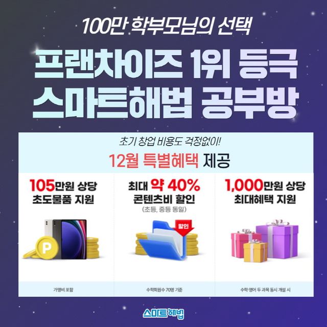 한편 스마트해법은 예비 원장님들을 위해 오는 19일(목), 20일(금) 양일간 온라인 사업설명회를 개최한다. 설명회는 오전 10시 30분, 스마트해법 공식 유튜브 채널을 통해 진행되며, 교육 창업에 필요한 유용한 정보를 제공할 예정이다. 이와 함께 ▲105만 원 상당의 초도 물품 ▲수강생 수에 따른 최대 40%의 콘텐츠 비용 할인 ▲타 브랜드 전환 시 최대 1,000만 원 상당의 혜택 등이 포함된 특별 가맹 혜택도 소개된다.
