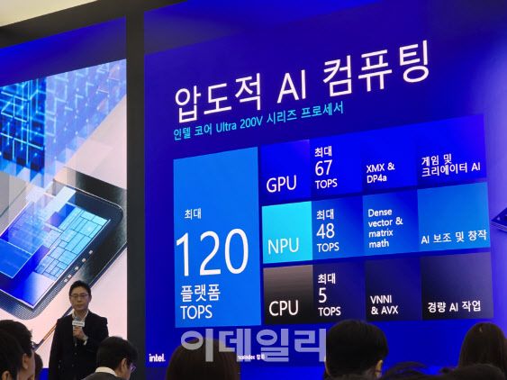 백남기 인텔코리아 부사장은 “루나테이크는 역사상 가장 뛰어난 성능이지만 50% 낮은 전력소비로 전성비를 높였다”며 “CPU, NPU, GPU에 워크로드별 잘돌아가는 앱 최적화를 통해 전체적으로 120톱스를 지원한다”고 소개했다.