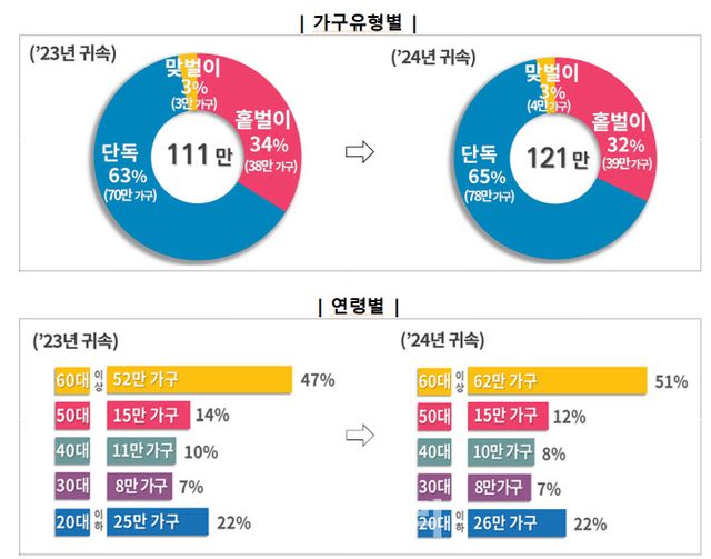 가구 유형별로는 1인 가구 증가에 따라 단독가구가 78만(64.8%)으로 가장 많다. 이어 홑벌이가구 39만(31.9%), 맞벌이가구 4만(3.3%) 가구 순이다. 연령기준으로는 △60대 이상(51.0%) △20대 이하(21.8%) △50대(12.3%) △40대(8.4%) △30대(6.5%) 순이다.