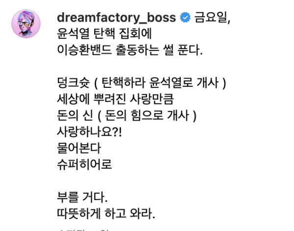 이와 함께 집회 무대 플레이리스트('덩크슛', '세상에 뿌려진 사랑만큼', '돈의 신', '사랑하나요?!', '물어본다', '슈퍼히어로')도 언급했다. 마지막으로 그는 "부를 거다. 따뜻하게 하고 와라"라고 덧붙였다.