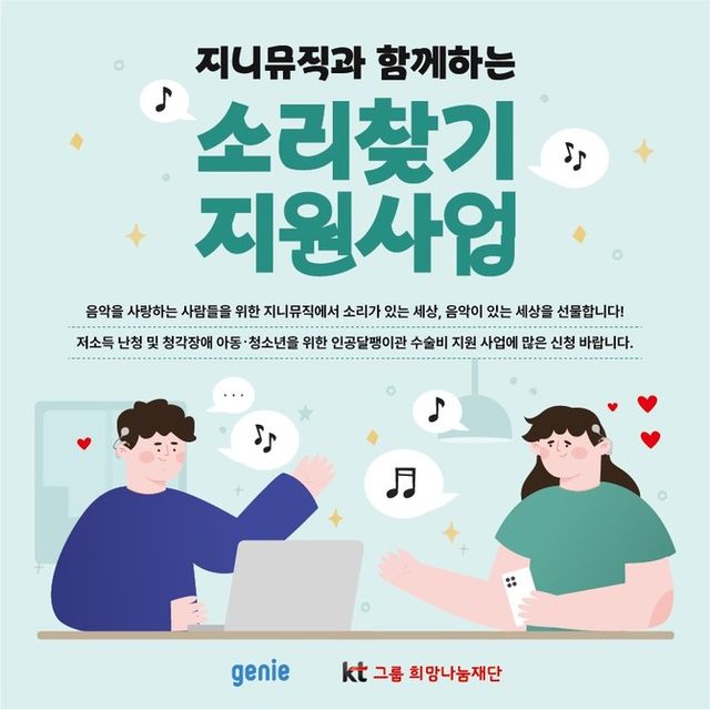 지니뮤직은 KT그룹희망나눔재단, 청각장애인생애지원센터와 협력해 난청아동 5명에게 각각 300만원씩 인공와우 수술비와 장치 교체비를 지원할 계획이다.