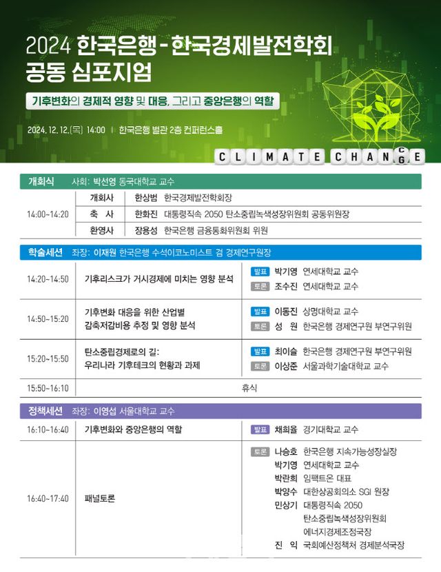 이번 심포지엄에서는 기후변화가 거시경제, 주력산업 등에 미치는 영향을 다각도로 진단하고, 기후위기 대응을 위한 정책 방향 및 중앙은행의 역할에 대해 논의했다.