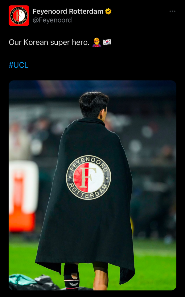 [풋볼리스트] 김희준 기자= 페예노르트에서 훌륭한 활약을 이어가는 황인범이 구단 공식 소셜미디어(SNS)에서도 극찬을 받았다.