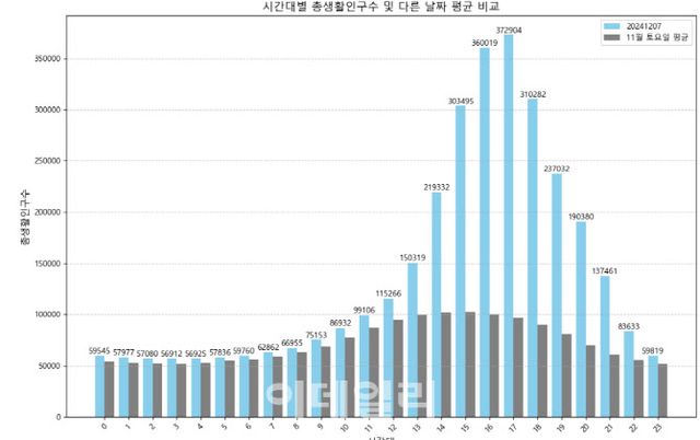 내국인 생활인구데이터에 따르면 탄핵 표결 시간인 오후 5시에 여의도 총생활인구수는 37만 2904명으로 가장 많았다. 서울 세계불꽃축제가 시작됐던 지난 10월 5일 오후 7시 여의도의 총생활인구수는 39만명이었던 것을 고려하면, ‘탄핵 집회 100만명’이 과장된 수치가 아니라는 평가도 나온다.