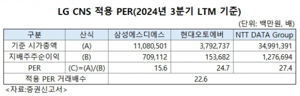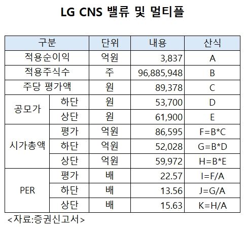 증권신고서에 따르면 LG CNS는 평가밸류로 8조6595억원을 제시했다. 적용 PER 22.57배에 올 3분기 기준 최근12개월치(LTM, Last Twelve Month) 순이익인 3837억원을 곱한 수치다. 적용PER은 피어그룹인 국내 종합 SI(시스템통합) 1위인 삼성SDS(15.6배)와 3위 현대오토에버(24.7배), 일본 SI업체 NTT DATA Group(27.4배) 3곳의 PER 평균치다.