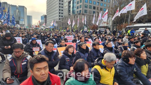 전국민주노동조합총연맹(민주노총)·한국노동조합총연맹(한국노총) 등 전국노동시민단체로 이뤄진 ‘윤석열 즉각퇴진 사회대개혁 비상행동(비상행동)’은 이날 오후 2시 서울 중구 세종대로에서 노동자·시민 대회를 개최하고 윤석열 대통령의 대국민 담화를 열렬히 비판했다. 이들은 중구 세종대로 4차선 도로를 가득 메울 정도로 많은 인파를 이뤘으며 주최 측에 따르면 이날 집회를 위해 모인 인원은 1만 명에 달했다.