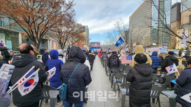 같은 시각 진보 단체 집회가 있던 장소 한켠에서는 보수 단체도 대규모 결집했다. 신자유연대를 비롯한 자유통일당 및 대한민국지키기운동본부(대국본) 등으로 이뤄진 국내 최대 규모 보수 단체 회원들은 오후 2시 서울 종로구 동화면세점 앞 광장을 가득 채우고 ‘윤석열 사수’를 외쳤다. 이들은 양손에 태극기와 성조기를 흔들며 애국가를 따라 불렀다. 주최 측에 따르면 이들 역시 1만 명의 집회 인원을 신고했다.