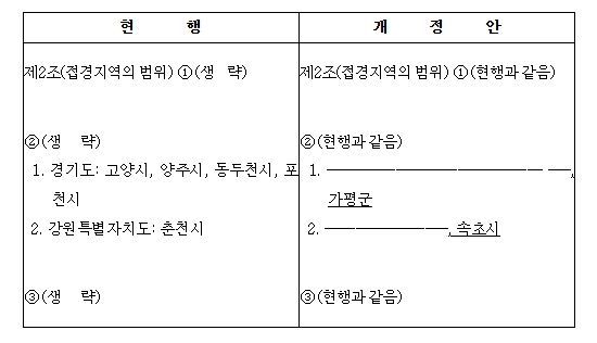 입법예고안은 기존 15개 접경지역에 가평군과 속초시를 추가로 지정하는 내용을 담고 있다.