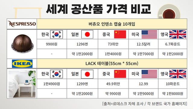 최근 한국에서는 캡슐커피 머신 없는 가정을 찾아보기 힘들 정도로 대중화 돼 있다. 스위스 기업인 네슬레의 네스프레소 버츄오 인텐스 캡슐 커피의 경우 한국, 일본, 중국, 미국, 영국 중 한국에서 제일 저렴한 가격에 판매되고 있는 모습을 확인할 수 있다.