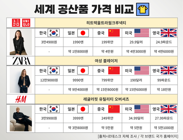 예로 한국, 일본, 미국, 중국, 영국에서 동일한 제품의 블레이저를 판매하고 있다. 한국에서는 12만9000원에 판매되지만, 일본에서는 9990엔(한화 약 9만4000원)에 판매되고 있는 모습을 확인할 수 있다.