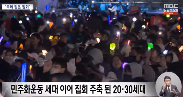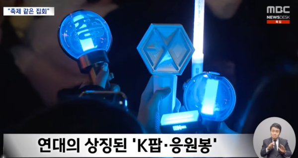 촛불 대신 K-팝 아이돌 팬들이 사용하는 응원봉이 등장했고, 집회 현장에는 아이돌 음악이 흘렀다.