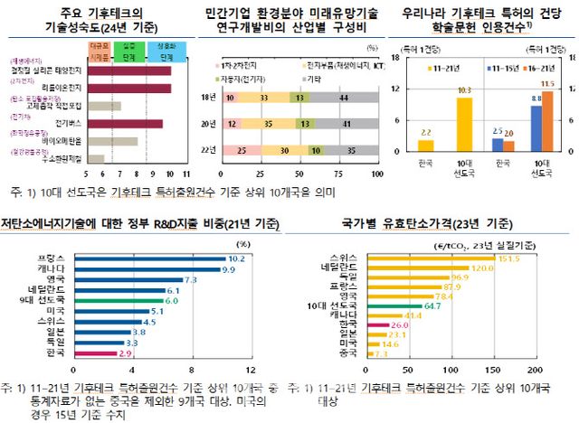 비슷한 맥락에서 우리나라가 온실가스 감축 등에 기여할 수 있는 기후 테크(Climate Technologies) 경쟁력 강화에 나서야 한다는 제언도 나왔다. 최이슬 한은 경제연구원 부연구위원은 “우리나라는 탄소다배출 제조업 중심의 수출 주도 경제구조인 만큼 기후 테크를 통한 혁신이 시급하다”면서, △정부의 연구·개발(R&D) 지원 강화 △탄소가격제의 실효성 제고 △혁신자금 공급여건 확충 등을 통해 기후 테크의 ‘선두 개척자’로 도약해야 한다고 역설했다.