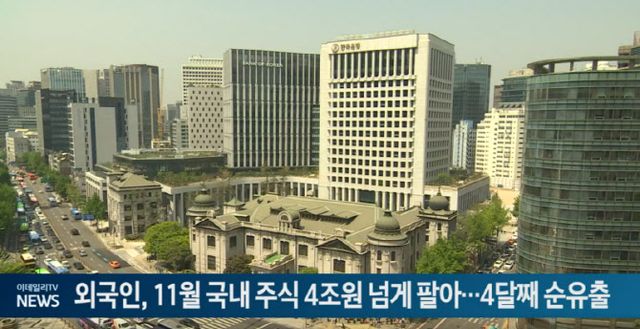한국은행이 오늘(12일) 발표한 ‘국제금융·외환시장 동향’에 따르면 11월 중 외국인의 국내 주식투자자금은 29억5000만달러 순유출됐습니다.