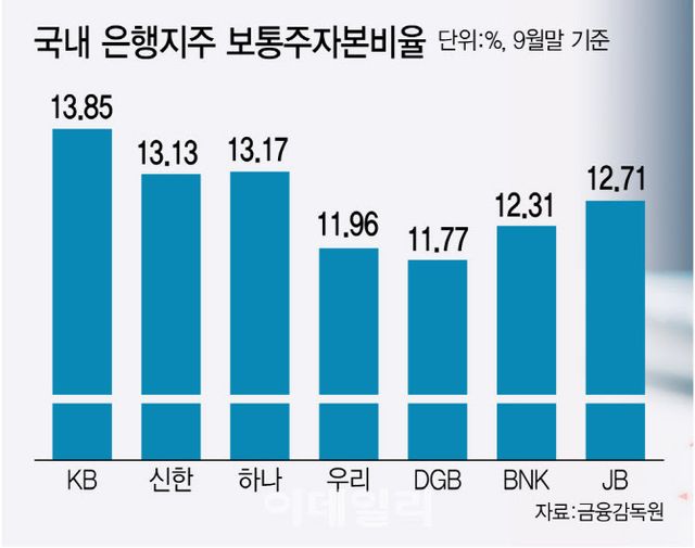 가뜩이나 이미 환율이 올라가면서 은행은 자본비율 관리에 비상이 걸렸다. 주요 금융지주의 지주사 CET1은 환율이 10원 오를 때 약 0.01~0.02%포인트 떨어지는 것으로 알려졌다. 은행 대부분이 스트레스 완충 자본을 추가 적립해도 규제 비율을 웃돌긴 하나 일부 지방은행 등은 CET1이 규제 비율 턱밑까지 차올랐다. 금감원에 따르면 지난 9월 말 기준 국내 은행(8개 은행지주·20개 은행)의 CET1은 13.33%였다. 우리금융(11.96%), DGB지주(11.77%), 기업은행(11.67%)은 금융당국 권고치인 12%를 밑돌았다.