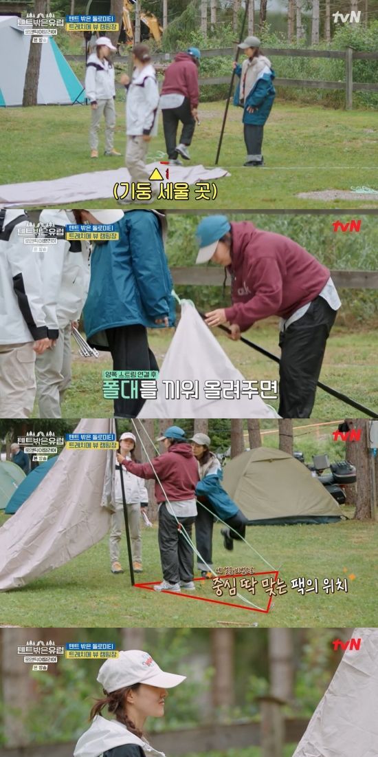 라미란은 "가운데 기둥을 먼저 세워서 천막 모양을 만든다. 세모를 그린 다음 팩을 먼저 박아준다. 처음에 너무 깊지 않게 박는다. 균형을 맞춰서 박아준다. 여기에 (스트링을) 걸어준다. 여기 구멍에 폴대를 이렇게 세운다"라며 시범을 보였다.