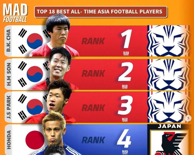글로벌 축구매체 '매드 풋볼'은 12일(한국시간) 사회관계망서비스(SNS)를 통해 "아시아 역대 최고의 축구 선수 18명"을 발표했다.