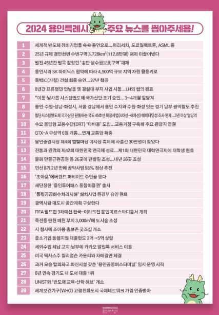 [와이뉴스] 용인특례시는 올 한 해 시를 빛냈던 최고의 이슈를 선정하기 위해 13일부터 18일까지 ‘시민이 뽑은 2024년 용인특례시 주요 뉴스’ 온라인 설문조사를 한다고 밝혔다.