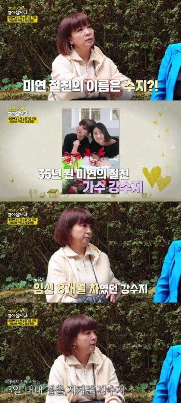 이날 원미연은 과거 아버지가 중환자실에 입원했을 당시 강수지가 만삭의 몸으로 3일 내내 병원을 찾아와 자신을 위로해주었던 일화를 공개했다. 원미연은 "보통 임신하면 장례식에 잘 안 오는데 3일 내내 왔다. 그게 평생 잊히지 않는다"며 강수지의 따뜻한 마음에 감동했던 순간을 떠올렸다.