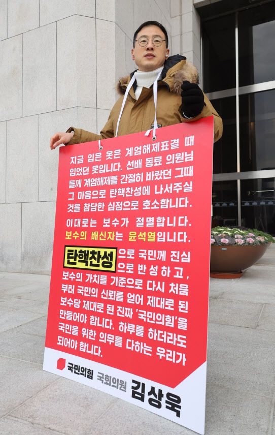 김 의원은 이날 서울 여의도 국회의사당 본청 앞에서 ‘이대로는 보수가 절멸한다. 배신자는 윤석열입니다’라는 내용의 적힌 팻말을 들고 1인 시위를 열었다.