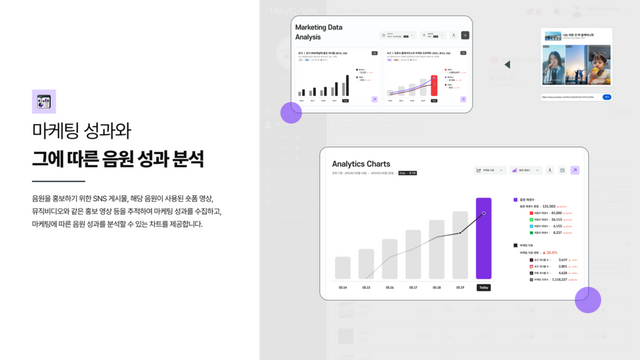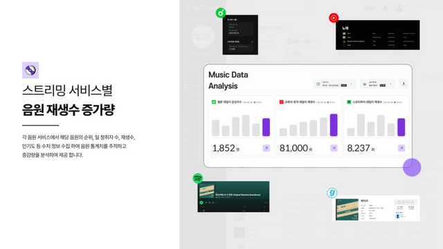‘Playcount’가 특화될 때는 바로 음원 마케팅과 프로모션의 진행. 프로젝트의 성과를 미리 분석하여 효율적인 전략 수정을 가능하게 하며 음원 유통사, 음원 마케팅 회사, 제작사 등 다양한 기업들에게 서비스를 제공해, K-POP과 같은 글로벌 음악 시장에서 효과적인 마케팅과 정산 대응을 이루고 있다.