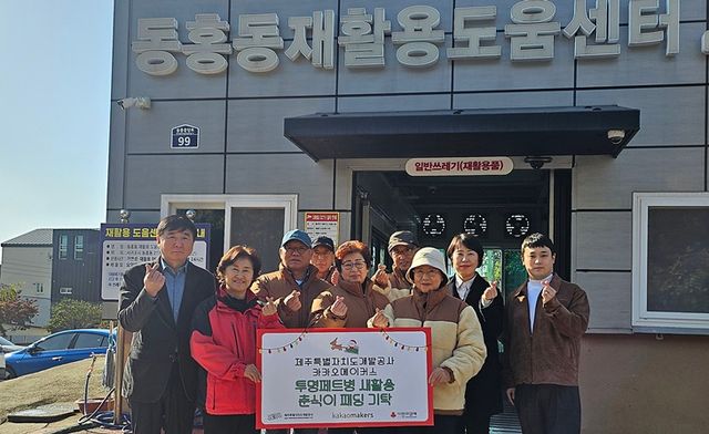 이들은 지난 12일 서귀포시 동홍동재활용도움센터를 찾아 제주 해양 폐플라스틱 새활용 제품인 '춘식이 패딩' 242장을 서귀포시에 전달했다.