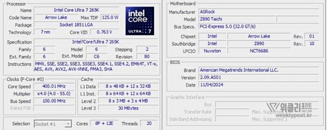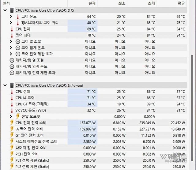 ▲ 인텔 코어2 울트라 7 265K 시피유에서 평균 29도 최대 84도 범위내에서 냉각했다. 쿨링 능력이 우수해 풀로드를 지속적으로 걸어놨으나 쓰로틀모드는 가동되지 않았다.