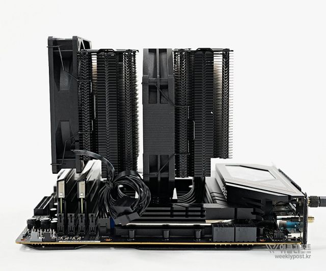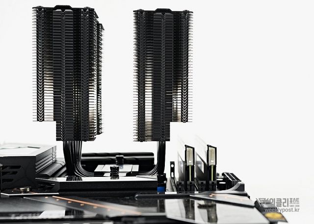 히트싱크 사이에 장착되는 쿨링팬은 140mm 규격으로 성능을 극대화하기 위한 조치로 풀이되며, 우측면의 쿨링팬은 120mm로 크기를 줄였다. 앞서 설명한 대로 메모리 슬롯과의 간섭을 최소화하기 위한 조치로 풀이되는 부분이다.