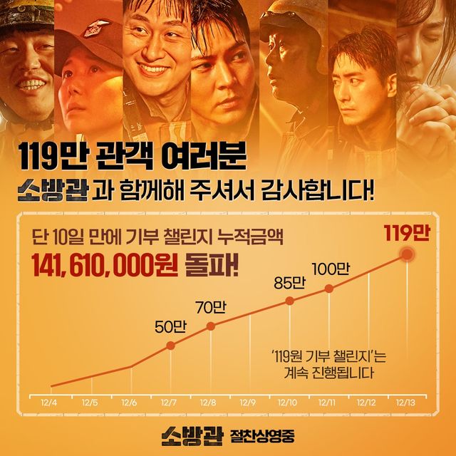 119만 돌파는 ‘119’의 의미를 담아 더욱 뜻깊다. 뿐만 아니라 영화 '소방관'은 1인 티켓 금액당 119원을 2025년 개원 예정인 국립소방병원에 현금 기부하는 ‘119원 기부 챌린지’를 진행하고 있는 가운데 현 기준 1억 4,161만 원을 돌파, 대한민국 관객들과 함께 선한 영향력을 행사하며 세상을 따뜻하게 바꾸는 뜻깊은 행보를 이어 나가고 있다.