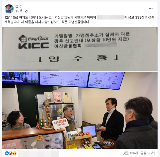333잔의 의미는 혁신당이 원내 3당인것과 조 전 대표가 기호 3번인 혁신당을 기억해달라는 의미를 담아 333잔을 결제했다고 알려졌다.