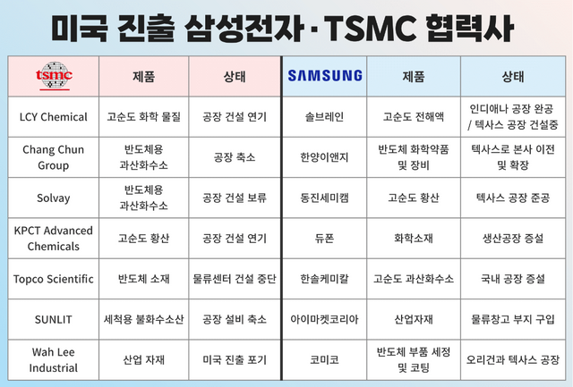 반면 삼성전자의 주요 협력업체들의 미국 진출은 순조롭게 진행 중인 것으로 나타났다. 고순도 전해액을 공급하는 솔브레인은 이미 인디애나에 공장을 가지고 있으며 텍사스 신규 공장 건설도 진행 중이다. 고순도 황산을 담당하는 동진세미켐은 삼성전자 테일러 공장 건설과 동시에 텍사스 공장 준공을 시작했다. 각종 산업자재를 다루는 아이마켓 코리아는 삼성전자 테일러 공장 인근에 부지를 구매해 물류창고를 건설 중이다. 그밖에 한솔케미칼, 코미코, 티씨케이 등의 협력사도 시설을 확장하고 있다.