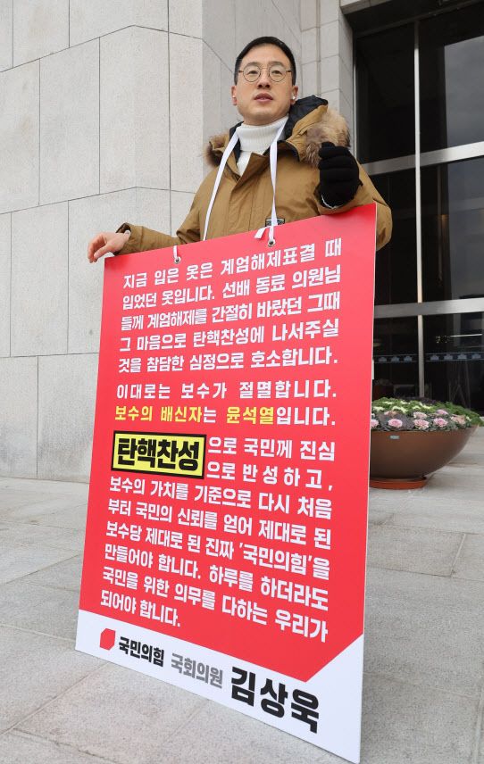 13일 김 의원은 이날 오전부터 국회 본청 입구 앞에서 피켓을 들고 1인 시위를 시작했다. 김 의원은 지난 4일 새벽 비상계엄해제요구안 표결 당시 입고 있었던 복장으로 시위에 나섰다.
