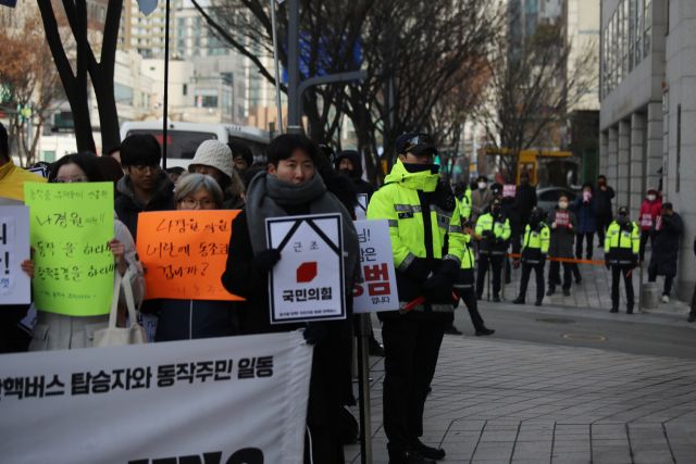 시민 90여 명은 13일 국민의힘 의원들에게 '윤석열 탄핵 찬성 투표'를 압박하기 위해 '탄핵버스'에 올랐다. 탄핵버스는 전국민주노동총연맹 서울본부, 전국언론노동조합, 너머서울, 서울시국회의 등 서울 지역 노동·시민사회단체와 노동당·녹색당·정의당·진보당 등 4개 진보정당 서울시당 등이 주최했다.