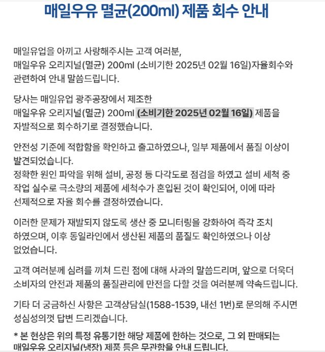 식품의약품안전처는 이날 제조일자가 9월19일, 소비기한이 2025년 2월 16일인 매일유업 오리지널 제품에 대해 회수 및 판매중단 조치를 내렸다. 특정 유통기한 제품만 해당되고, 그 외 판매되는 매일우유 오리지널(냉장) 제품은 이상 없다.