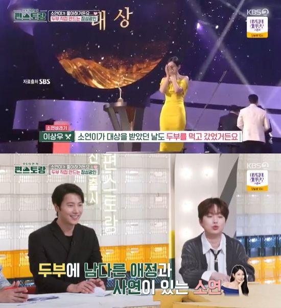 이상우는 "사실 저는 두부를 그렇게 선호하지 않는다. 소연이가 좋아한다. 직접 만든 두부면 더 좋아하지 않을까 해서. 소연이가 대상을 받았던 날도 두부를 먹고 갔었다. 두부를 먹으면 또 좋은 기운이 있지 않을까 해서 직접 만들어 보려고 한다"라며 아내를 향한 애정을 드러냈다.