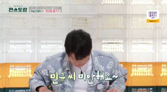 이 말을 들은 류수영이 급히 구레나룻을 정리하며 멋진 표정을 지어보이자 붐은 "왜 갑자기 옆을 누르냐"라며 황당함을 금치 못했다. 이어 류수영은 "세븐틴 민규 씨 미안하다"라며 공개 사과를 보내 웃음을 자아냈다.