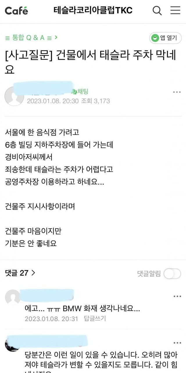 건물에서 테슬라 주차 막네요