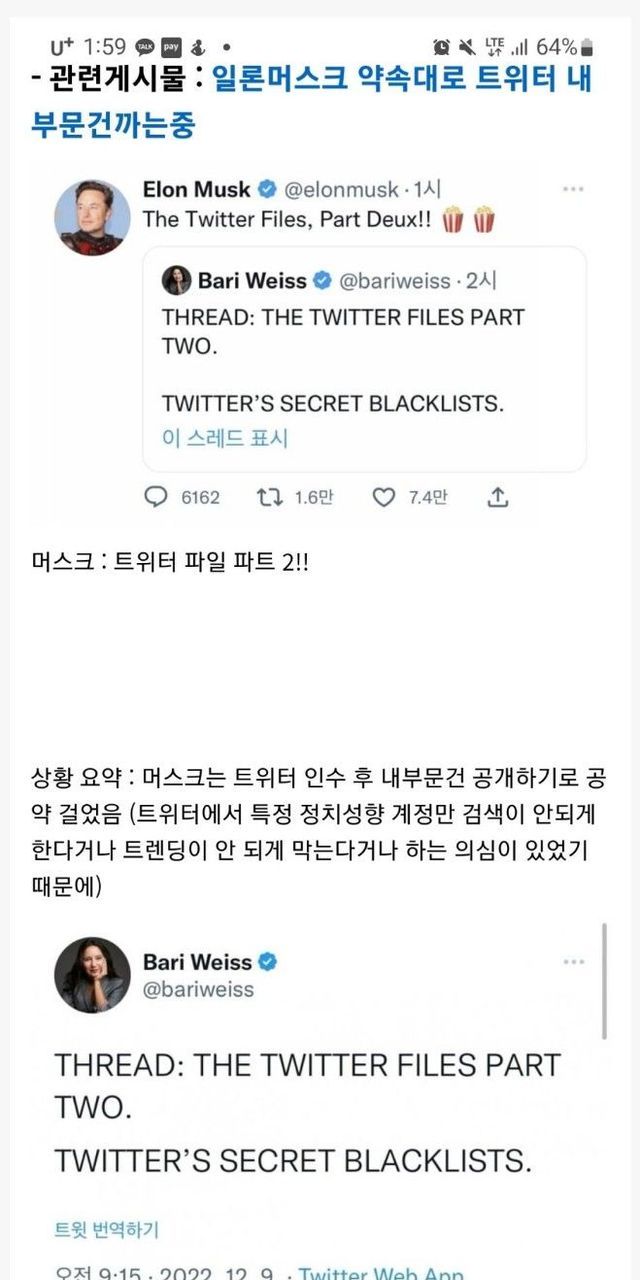 약 스압) 머스크 트위터 내부문건 까기 시작.