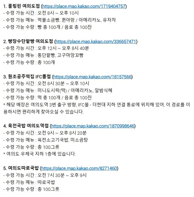 이번에 선결제가 진행된 음식점은 '롤링핀', '빵장수단팥빵', '원조공주떡집', '육전국밥', '여의도따로국밥'으로 14일 오전부터 선착순으로 핫팩과 음식을 제공받을 수 있다.