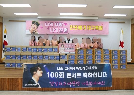 최근 이찬원 팬클럽 '찬또배기 대구톡방'은 대한적십자사 대구시지사에 컵라면(12개입) 100박스, 친환경 세제(3종) 100세트 포함 총 3,700,000원 상당의 생필품을 기부했다고 밝혔다.