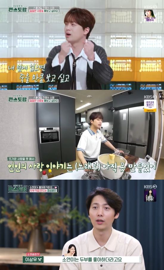 그는 사실 두부를 그렇게 선호하지 않지만 아내 김소연이 좋아한다고. 이상우는 "직접 만든 두부면 더 좋아하지 않을까 해서. 소연이가 대상을 받았던 날도 두부를 먹고 갔었다. 두부를 먹으면 또 좋은 기운이 있지 않을까 해서 직접 만들어 보려고 한다"라며 애처가 다운 모습을 보였다.