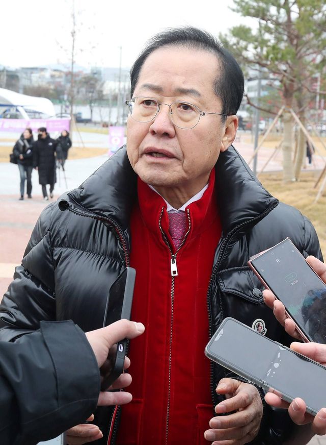 홍준표 대구시장이 윤석열 대통령 2차 탄핵소추안 표결을 하루 앞둔 지난 13일 오전 대구 서구 서대구역에서 열린 대경선(대구경북선) 광역철도 개통식을 마친 뒤 취재진 질문에 답하고 있다. / 뉴스1
